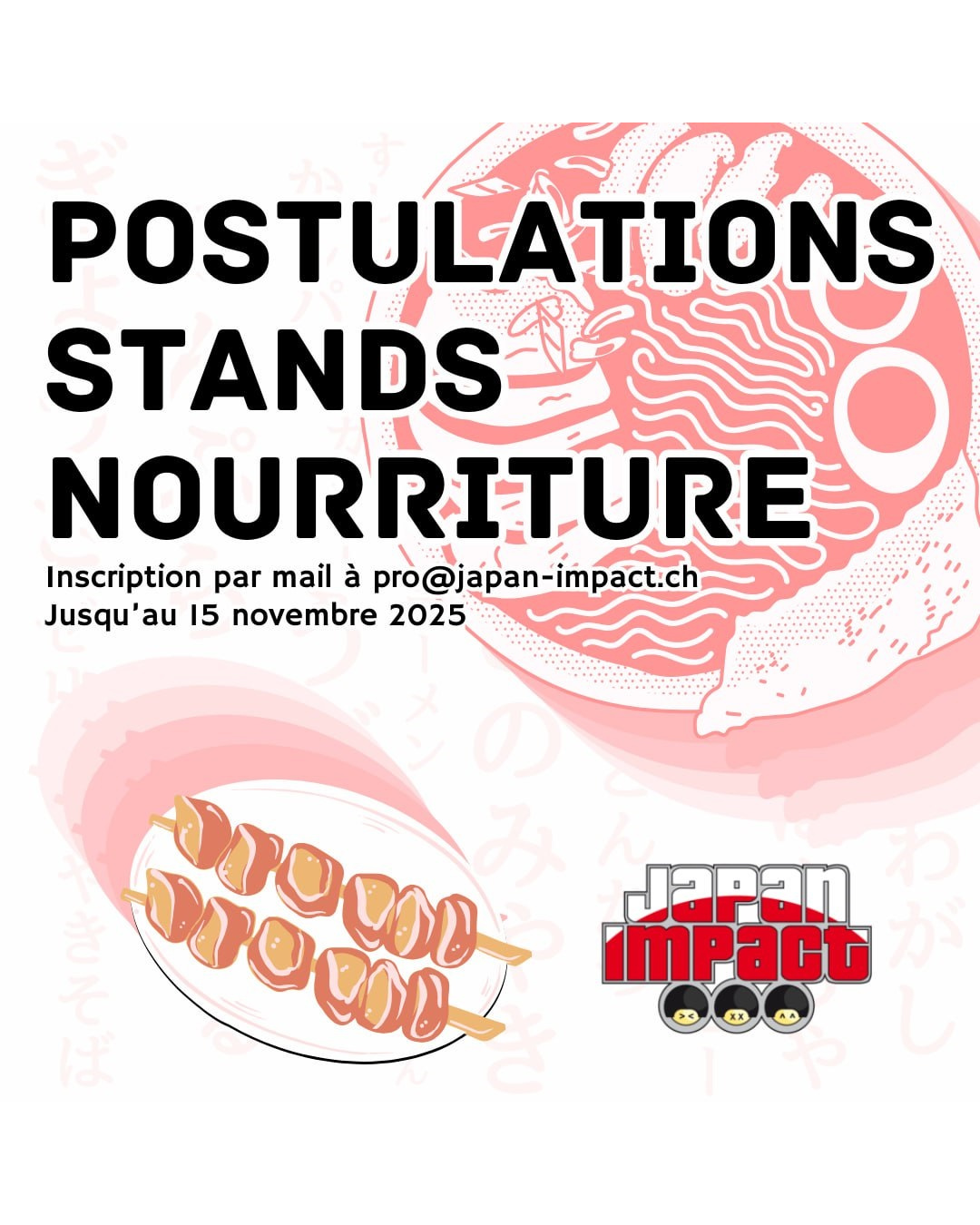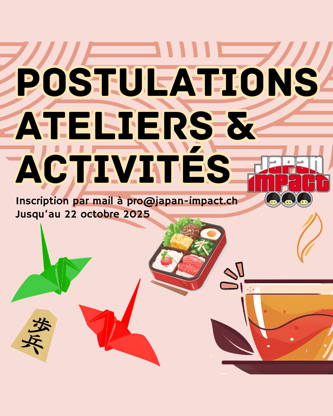 Dernier appel pour proposer ton atelier pour Japan Impact 2026 ! Culinaires, créatifs ou sportifs : envoie ta candidature à pro@japan-impact.ch.